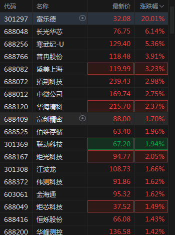 富乐德20CM涨停,长光华芯涨超6%,寒武纪涨超5%。
