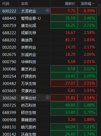 太龙药业涨超8%,康龙化成涨超2。