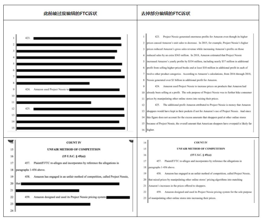 2023年9月,美国联邦贸易委员会(FTC)和17个州对世界上最大的公司之一亚马逊提起反垄断诉讼,指控其垄断和不公平竞争方式。《互联网法律评论》此前曾就FTC诉状中被“删节”的“尼斯湖水怪计划”(Project Nessie)发表评论文章指出,专门针对这项计划的每一处描述几乎都被黑条挡住,这使公众难以获悉真相。