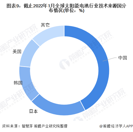 其中,全球太阳能电池第一大技术来源国为中国,我国太阳能电池专利申请量占全球太阳能电池专利总申请量的42.31%;其次是日本,日本太阳能电池专利申请量占全球太阳能电池专利总申请量的20.70%。韩国和美国分别排名第三和第四,占比也均超过10%。