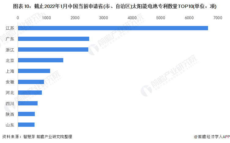 中国方面,江苏为中国当前申请太阳能电池专利数量最多的省份,累计当前太阳能电池专利申请数量高达6661项。广东、浙江、北京和上海当前申请太阳能电池专利数量均超过1000项。中国当前申请省(市、自治区)太阳能电池专利数量排名前十的省份还有安徽、河北、四川、陕西和山东。