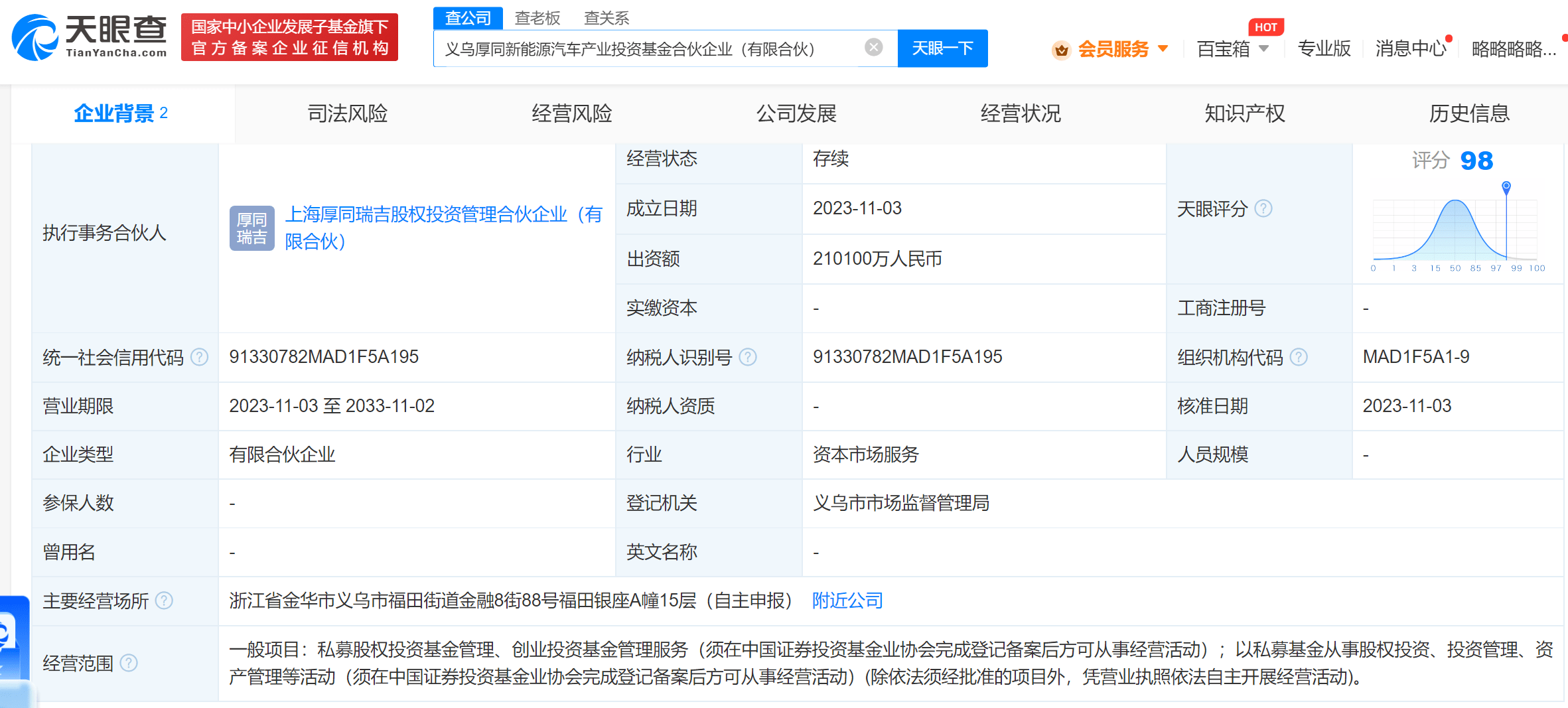 天眼查App显示,近日,义乌厚同新能源汽车产业投资基金合伙企业(有限合伙)成立,执行事务合伙人为上海厚同瑞吉股权投资管理合伙企业(有限合伙),出资额21.01亿人民币,经营范围含私募股权投资基金管理、创业投资基金管理服务等。股权全景穿透图显示,该合伙企业由义乌市国有资本运营有限公司旗下义乌市基金投资有限公司和吉利厚同资本旗下上海厚同瑞吉股权投资管理合伙企业(有限合伙)共同出资。