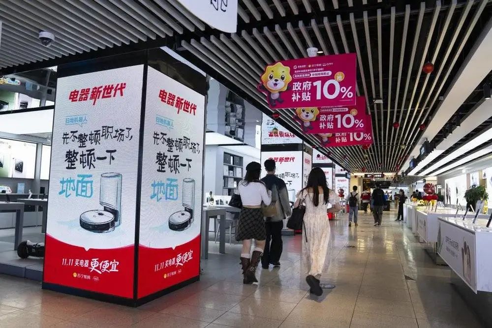 一个明显的变化是,今年双11,如果要买家电,去到苏宁易购线下门店一看就会发现,不管是购物广场的广告屏,还是门店内很多家电产品旁边,都配以或“发疯吐槽”或“笑中带泪”的带梗文案。