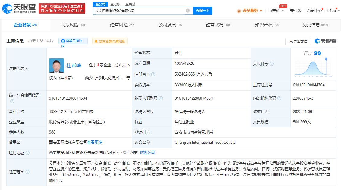 天眼查App显示,近日,长安国际信托股份有限公司发生工商变更,高成程卸任法定代表人、董事长,由杜岩岫接任,同时,公司注册资本由33.3亿人民币增至约53.24亿人民币,增幅约59.88%。