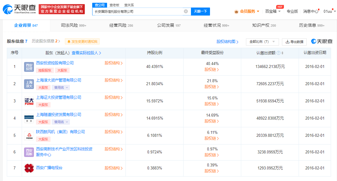 长安国际信托股份有限公司成立于1999年12月,经营范围包括资金信托、动产信托、不动产信托、有价证券信托、其他财产或财产权信托等,由西安投资控股有限公司、上海淳大资产管理有限公司、上海证大投资管理有限公司等共同持股。