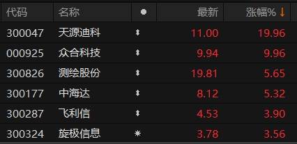 上证报中国证券网讯 11月8日上午,A股时空大数据板块走强。11时03分,天源迪科、众合科技涨停,测绘股份、中海达涨超5%。