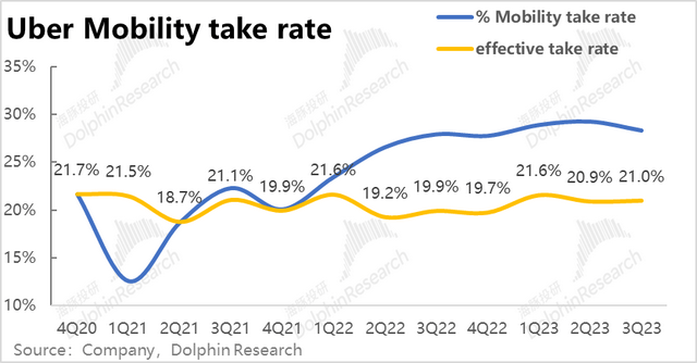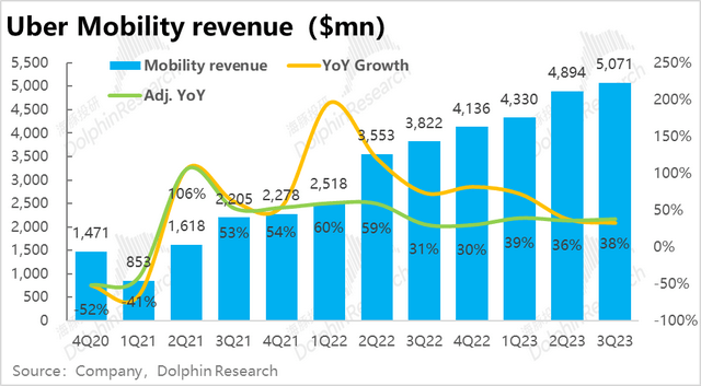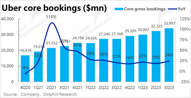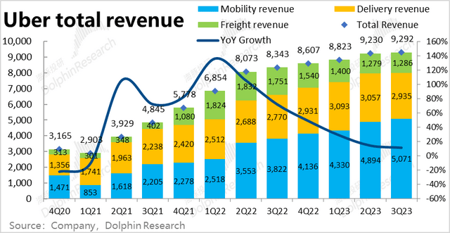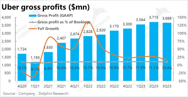 由于Uber在英国和加拿大等地区的部分业务因法律原因,从平台型转变为自营模式,公司确认的营收也从净佣金变为总付款金额,导致营收有所放大,因此下文海豚君主要从剔除会计变更影响后的表现。