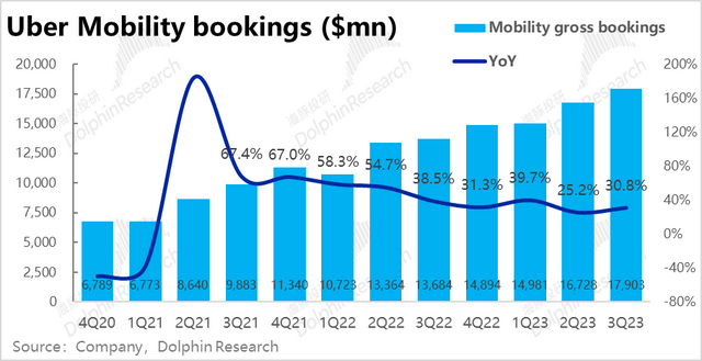 1. 下单频率增长,驱动订单金额坚韧增长:Uber基本盘的打车(Mobility)业务板块,本季度实现订单金额179亿美元,高于市场预期的174亿,同比增速也回升到30%以上。