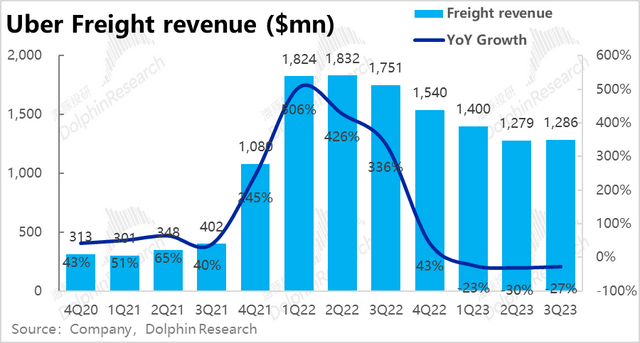 Uber的货运业务本季度实现了营收12.8亿元,在连续多个季度环比下跌后,本季度总算出现了企稳的迹象,但影响不大。