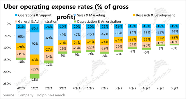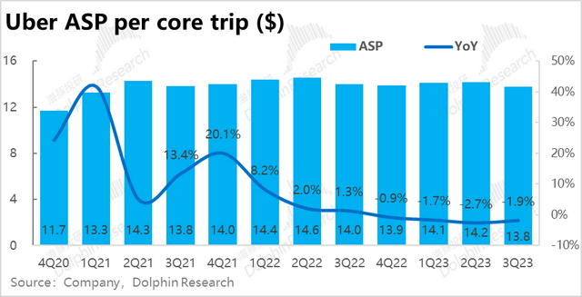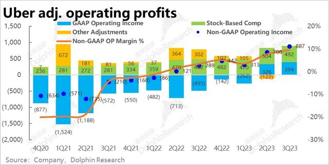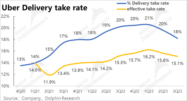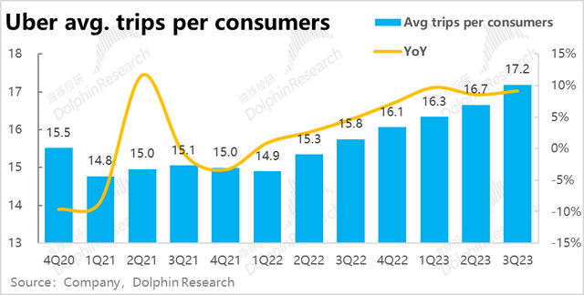 但下单频率上,本季度人均下单次数达到17.2次,较上季的16.7次继续稳步提速。海豚君认为Uber one交叉会员,以及公司分别在打车和外卖板块上拓展出的新产品,促进了用户黏性和打开率的上升,在新用户增量已放缓的情况,仍帮公司实现了不俗的增长。