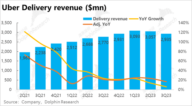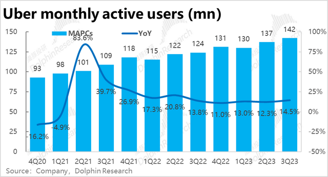 疫情后逆风的Uber的外卖业务本季实现订单金额161亿元,同样小超市场预期的158亿,同比增速触底回升到17.6%,也展现出了边际改善的趋势。