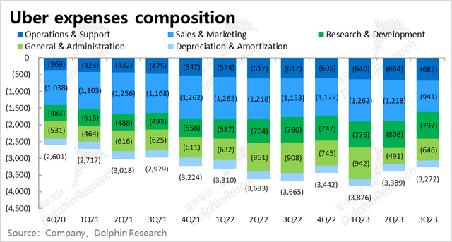 可见本季价和用户的角度表现并算不上好,但Uber用户下单频次的提升,这一关键的改善是公司本季业务量坚挺增长的根本原因。本季度人均下单次数达到17.2次,较上季的16.7次继续稳步提速。海豚君认为融合两大业务的Uber one交叉会员,和公司分别在打车和外卖板块上拓展出的新产品、新品类,增强了用户对Uber的黏性和打开频率,加强了公司中长期的成长潜力。