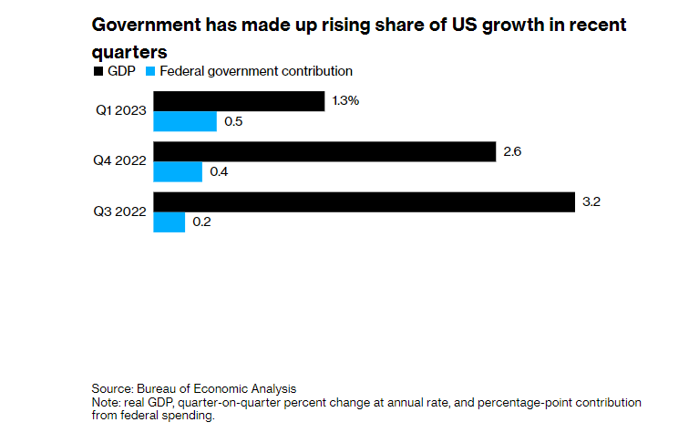 最近几个季度的联邦支出,在住宅建设低迷等不利因素的情况下,帮助支撑了美国经济增长,而债务上限协议可能至少会抑制这种推动力。外媒的一项调查显示,在达成债务上限协议两周前,经济学家预计未来一年经济衰退的可能性为65%。