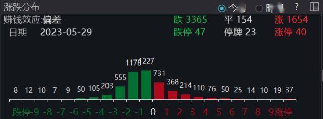 个股方面,整体来看,个股跌多涨少,两市共计1654只个股上涨,3365只个股下跌,154只个股持平,赚钱效应由前一交易日的“好”转为“偏差”。