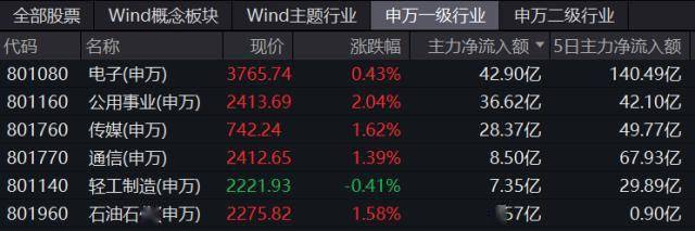主力资金流向上,电子行业今日主力资金净流入额位居31个申万一级行业第一,为40.90亿元。值得注意的是,电子行业近5日的主力资金净流入额高达140.49亿元!公用事业则排行第二,今日净流入额为36.62亿元,净流出方面,电子设备、汽车、食品饮料居前。