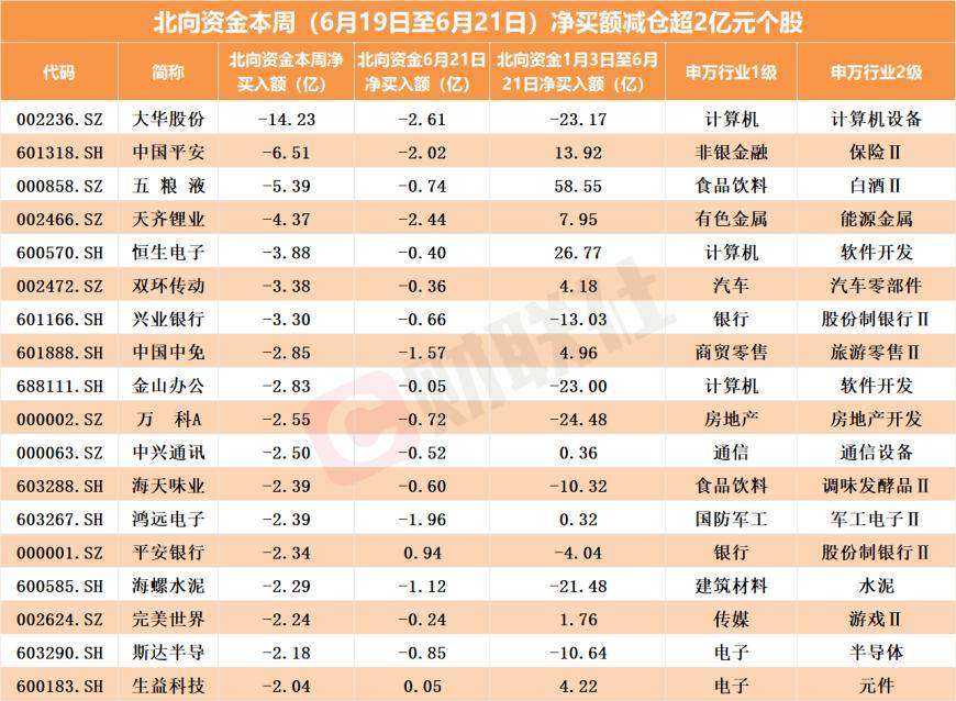 在北向资金卖出一侧,6月21日,三六零、大华股份、天齐锂业、中国平安减仓均超2亿元。