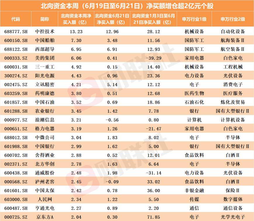 从周度(6月19日至6月21日)表现看,北向资金周净买额累计超2亿元的个股有22只(见下表)。中控技术可谓“一枝独秀”,为本周唯一加仓额超10亿元个股。中国船舶、西部超导、美的集团、三一重工、阳光电源、立讯精密净买入额在4亿至7.5亿元之间。