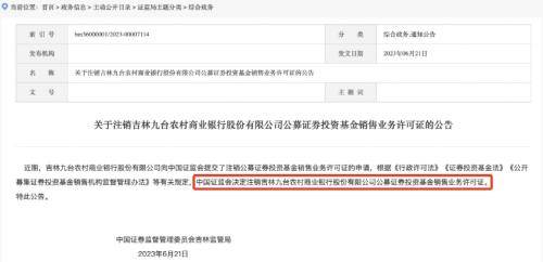 6月21日,吉林证监局发布《关于注销吉林九台农村商业银行股份有限公司公募证券投资基金销售业务许可证的公告》。