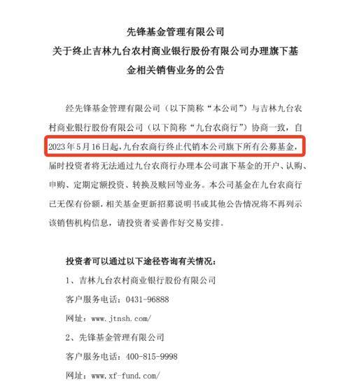 5月16日,先锋基金发布公告称,公司与吉林九台农村商业银行股份有限公司(以下简称“九台农商行”)协商一致,该行将终止代销先锋基金旗下所有公募基金产品。吉林九台农商行也由此成为年内首家被基金公司终止基金销售合作的银行机构。