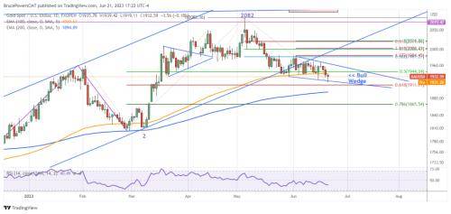 如果该模式继续发展且价格保持在该线内,则肯定有可能再次测试下线。如果金价持续跌破今日低点,则将相对接近两个关键的潜在支撑区域。第一个是位于1912美元的61.8%斐波那契回撤位,其次是位于1895美元的200日均线。当然,200日线是最重要的,因为它代表了长期趋势。黄金在今年第一季度测试200日线,价格明显被双底形态拒绝。相对而言,在金价触及200日均线之前出现看涨反转,将显示出自先前测试触及该线以来金价有所改善。