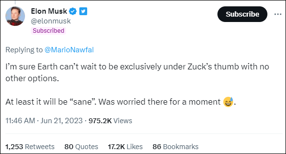 在有关新闻的推特评论区,马斯克点名扎克伯格称,“我敢肯定,地球迫不及待地想要完全被扎克伯格掌控,没有其他选择。”
