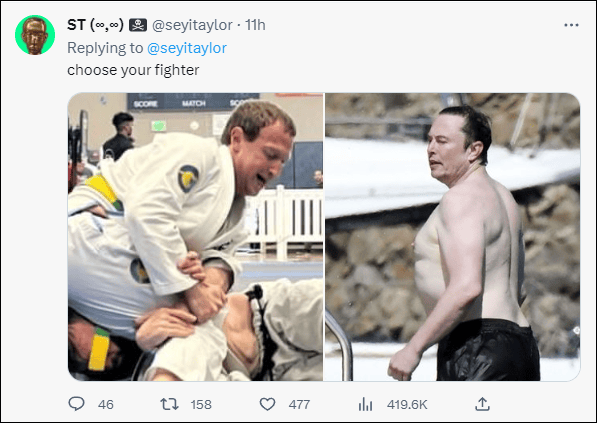 比如有人将马斯克和扎克伯格做成了对比图,并写道:“请选择你的战士”。