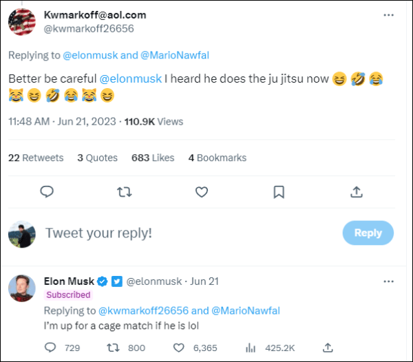 马斯克不甘下风:“如果他真的会,我准备好和他来一场笼斗,哈哈哈!”