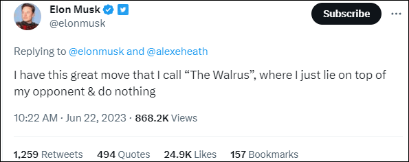 面对有点真功夫的扎克伯格,马斯克调侃道,他有一个名为“海象”的绝招,可以轻松把对手压在身下。马斯克还说:“我几乎从不锻炼,除了把我的孩子抱起来扔到空中。”