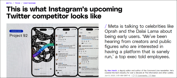 最近,The Verge等科技媒体注意到,扎克伯格的Meta公司一直在准备代号为“Project 92”类推特项目,有望在本月底推出,这款对标推特的应用可能会被命名为“Threads”。Meta首席产品官克里斯・考克斯(Chris Cox)在描述这一产品时直言,这是“对推特的回应”,它将允许INS用户自动将他们的关注者和用户信息直接转移到这款新的应用程序中。