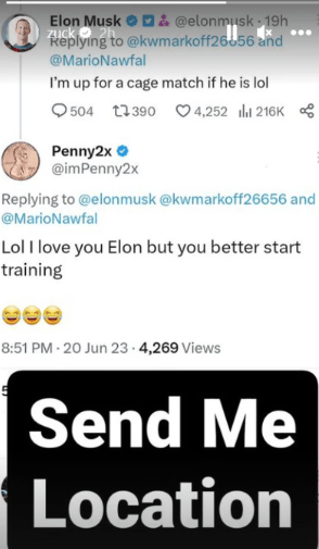 这时,有网友回应马斯克说:“最好小心点,我听说他现在会柔术了。”