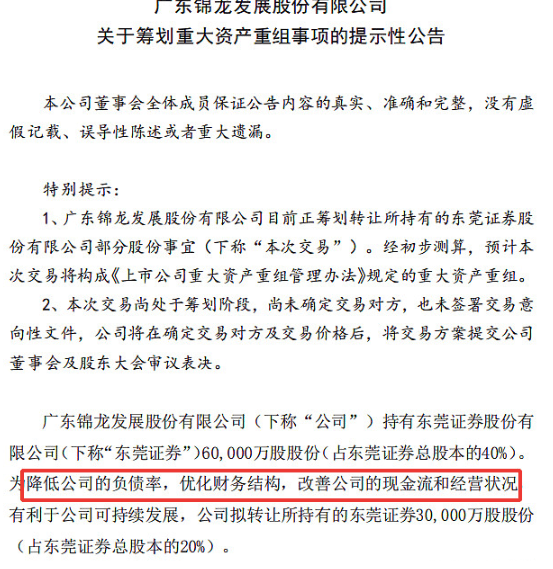 锦龙股份:拟出售所持东莞证券半数股权