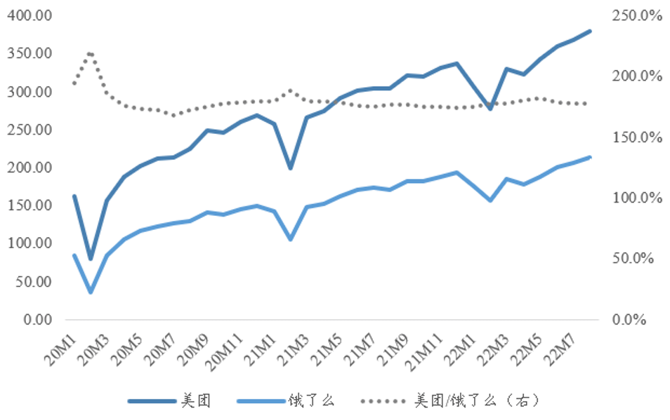 接入商家数给出了更直观的对比,截至2022年底,美团财报公布的接入商家数已经达到900万家,而有媒体根据阿里零售通信息推测,同期饿了么的商家数量在600万左右。更有媒体报道称,美团的骑手数量超过饿了么的1.5倍,二者在运力上的差距日趋明显。