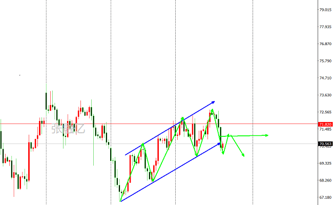 周四原油出现了高开低走走势,最高点在72.628美元/桶开始下跌,最低点触及70.0美元/桶水平徘徊。日线走势图上看,原油从72.10开始上涨在72.64就出现颓势,目前回落已经超出预期,同时已经打破支撑,所以油价66.80开始的上涨浪已经结束了。四小时线也是出现顶部信号,出现明显的黄昏之星,就是阴线实体直接覆盖阳线的实体,同时击穿50均线,下方继续看69一线,上方也是明显的双重顶形态。综上所述张融亿总结:原油趋势转跌,后市考虑反弹做空为主,上方关注70.8-71.5美元/桶阻力,下方关注69.5-68.1美元支撑。