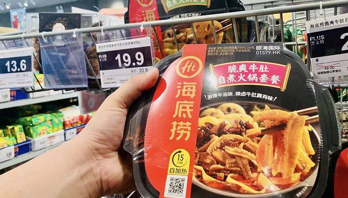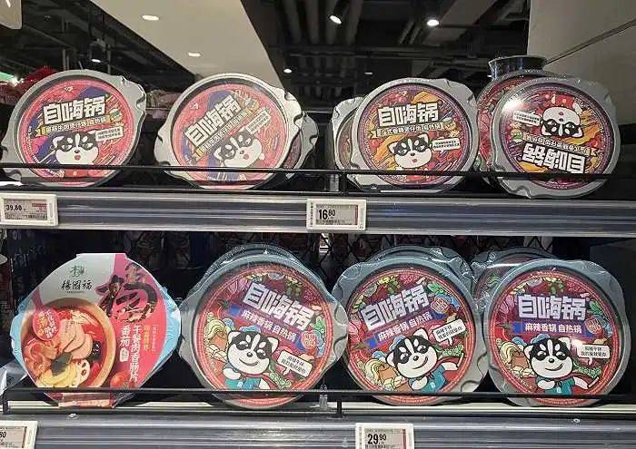 7.7元的自嗨锅骨汤粉、10.9元的莫小仙自热火锅麻辣烫、19.9元的海底捞自煮火锅比比皆是。哪怕在常规商超渠道, 一些生产日期很新的产品也从上架第一天就加入大促。永辉超市货架上的海底捞自煮火锅产品从39.9元的价格做活动降到29.9元,在盒马北京朝阳区的一家门店,自嗨锅、杨国福更是把售价更低的产品摆在货架的显眼位置。