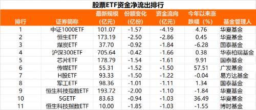 行业主题中,国泰煤炭ETF净流出1.84亿元,国泰芯片ETF净流出1.61亿元,广发传媒ETF净流出1.50亿元,另有国泰军工ETF、华夏恒生科技指数ETF、华夏5GETF,以及博时恒生科技指数ETF净出资金也超过1亿元。