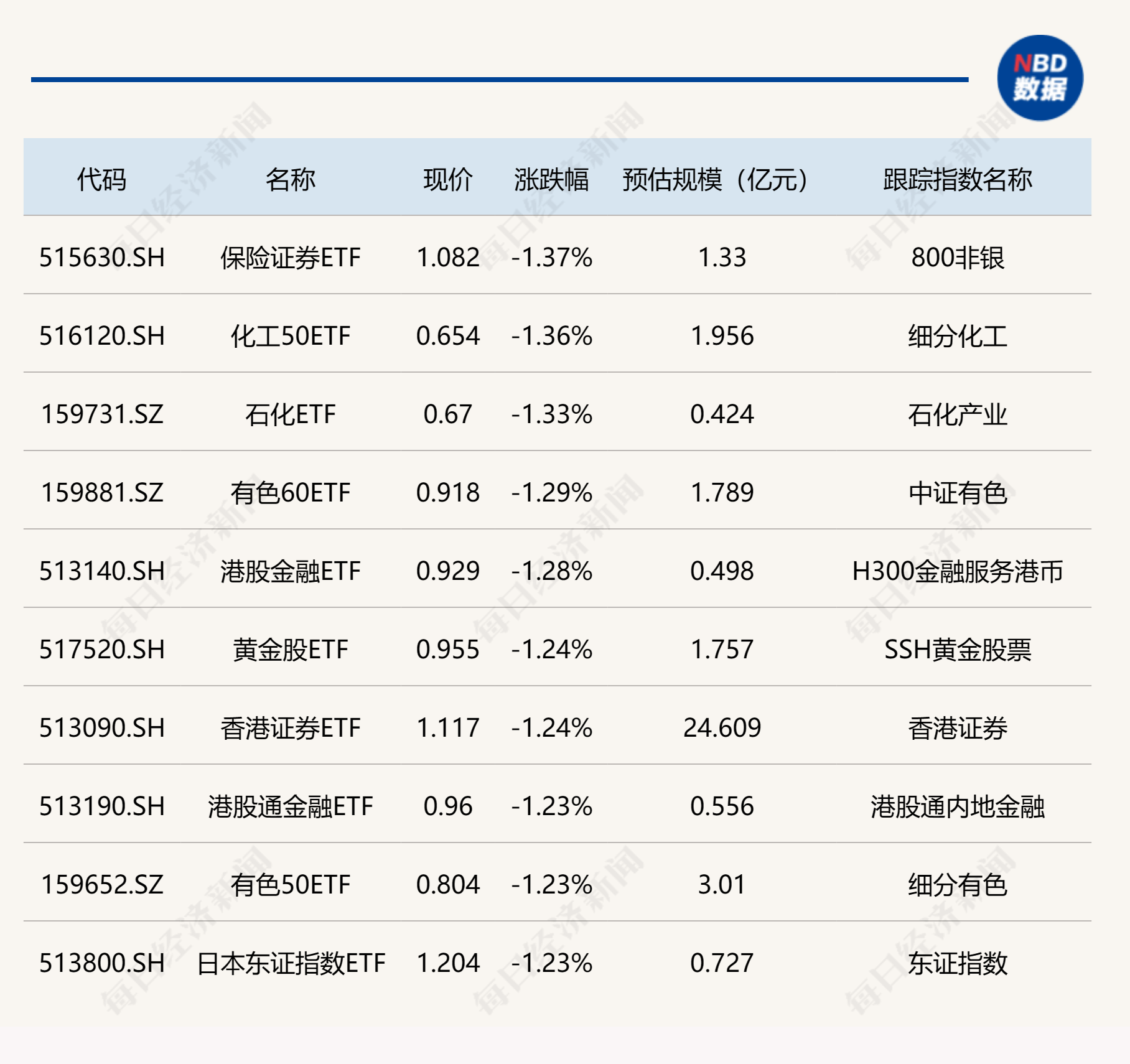 下跌方面,保险证券、石油化工等相关ETF跌逾1%。