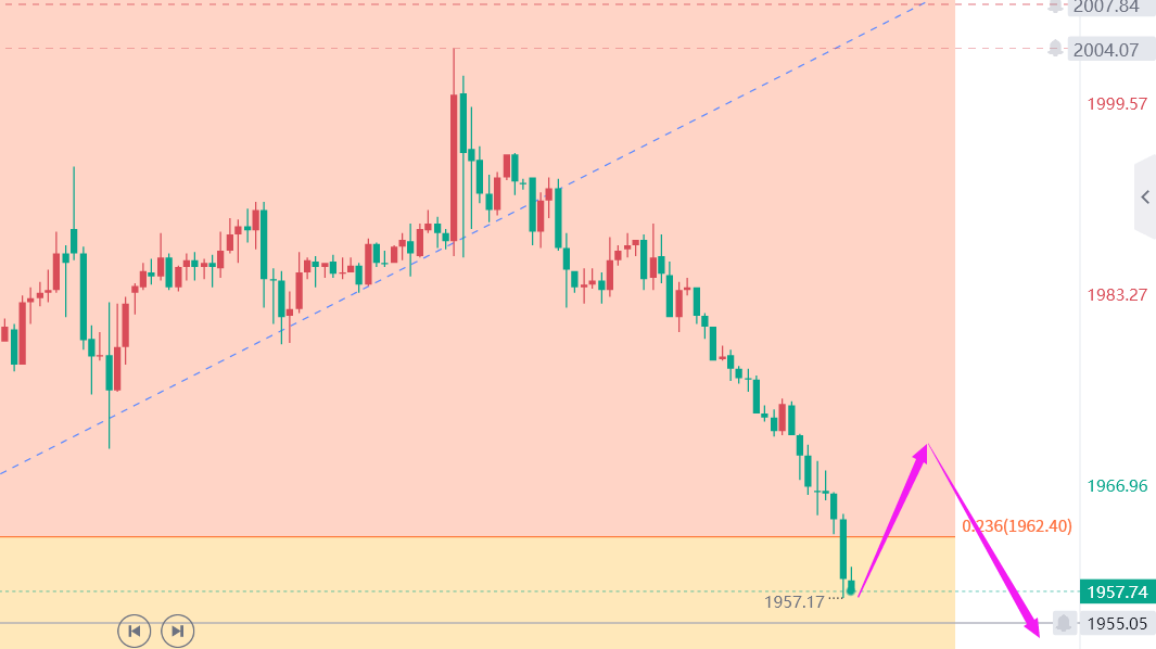 黄金走势分析:走势上看,继上周五非农一波拉伸未能破高之后经过反复之后也是逐步转弱,本周前两天反复震荡回落走势,周一晚间跌破1980之后空头加剧,上个交易日早盘在1976附近直接一路震荡回落,欧美盘延续弱势格局一路跌破1960惯性回落到1956附近企稳回升,目前反抽1870附近,短期来看阶段性回落修正到位,下方关注1953/1950这个前期平台支撑,暂时不能过分看空,上方关注1980附近压力可以继续做空。