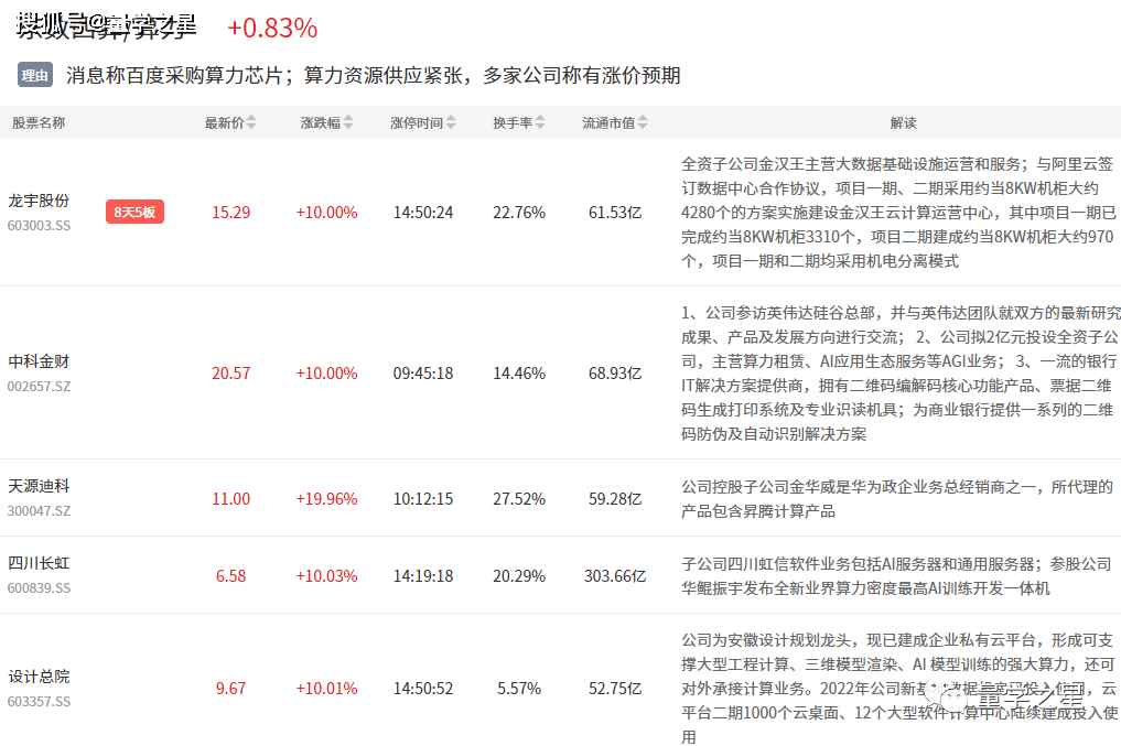 算力概念今日大涨,服务器、算力芯片、算力调度等多个细分爆发,龙宇股份、中科金财等涨停。
