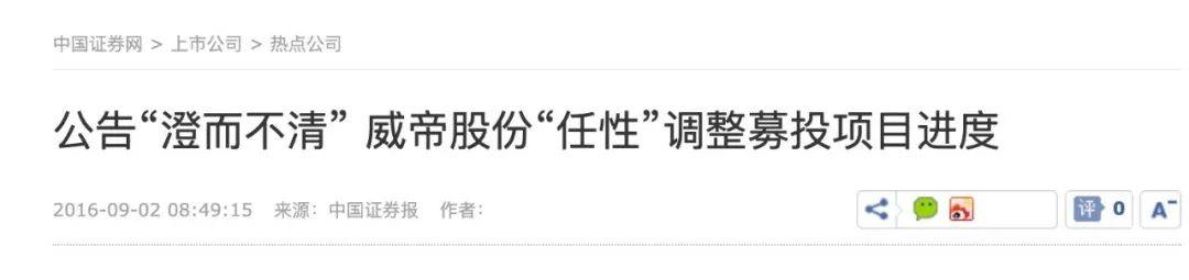 被媒体质疑后威帝股份发布澄清公告,表示将结合实际情况加快募投项目的实施进度,同时表示“对项目实施进度计划做了适当调整”。不过对于进度调整的决定是何时、由谁作出以及新的进度计划,包括对公司生产经营的具体影响都没有披露,被《中国证券报》质疑涉嫌违反交易所对于上市公司募集资金管理办法的相关规定,同时涉嫌违反信披规定。