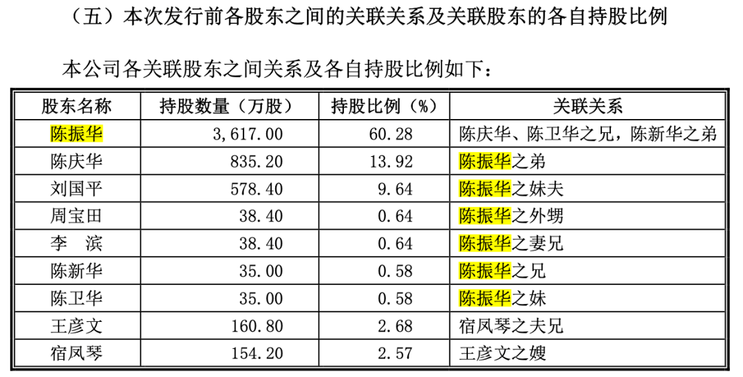 2009年,公司开始进行上市前的改制,彼时公司引入了四位新股东,其中周宝田和李滨也分别是陈振华的外甥和妻弟,二人各出资30万元就拿到了38.4万股。因此改制后,威帝股份的家族色彩更加浓重,IPO前,陈振华家族持股比例超80%。