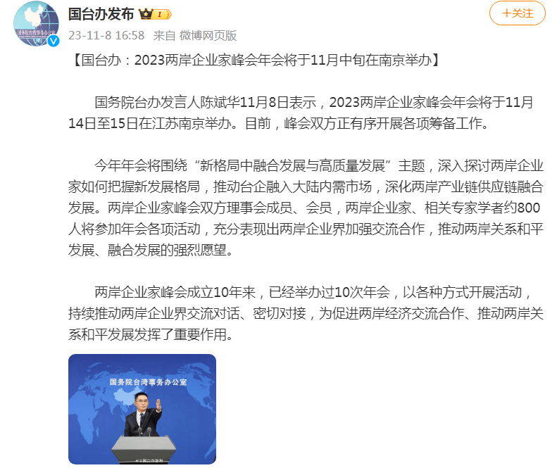 国务院台办发言人陈斌华11月8日表示,2023两岸企业家峰会年会将于11月14日至15日在江苏南京举办。目前,峰会双方正有序开展各项筹备工作。