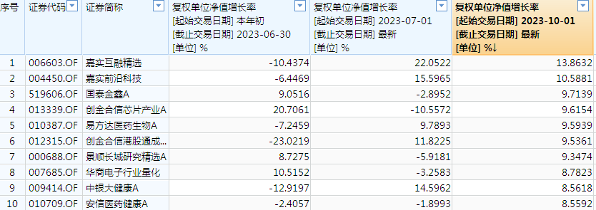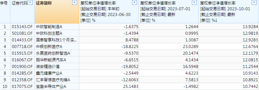 从四季度以来业绩领先的品种看,中欧智能制造A截至11月7日业绩录得13.93%领先市场同类基金,三季度末重仓股中,智立方、芯碁微装等最近10天的涨幅均超过20%。另一只股票型基金嘉实互融精选则凭借着在医药行业的配置,上涨了13.86%。