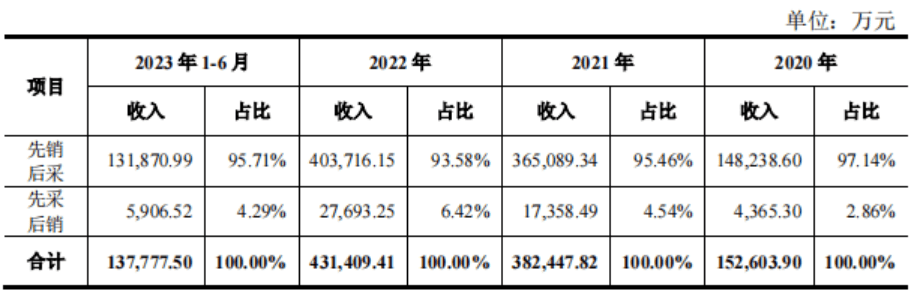 云汉芯城在《招股书》中表示,自己有两种销售模式,分别为“先销后采”和“先采后销”。在报告各期,云汉芯城“先销后采”模式贡献收入超过95%以上,而“先采后销”贡献收入最高的年份,出现在2022年,全年贡献营收占比6.42%。