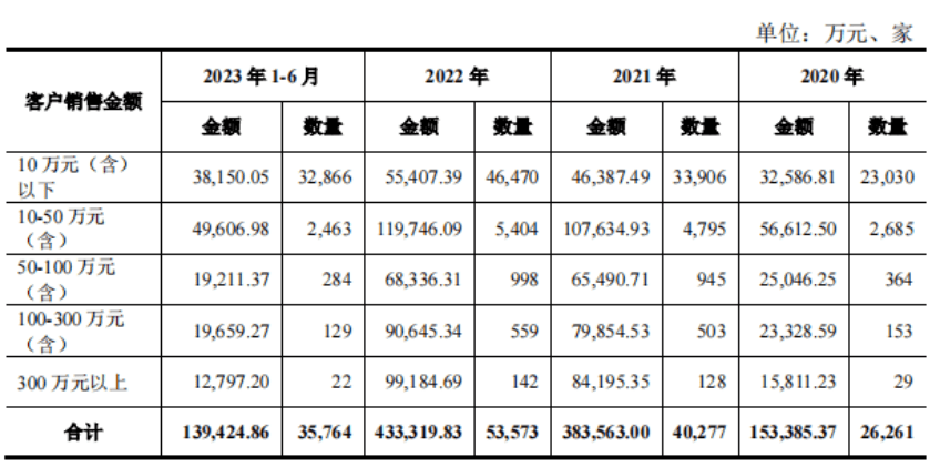 《招股书》显示,云汉芯城采购金额在50万以下的客户,占到了绝大多数,而采购金额在300万元以上的客户,数量很少,今年上半年仅有22家。这更加验证了云汉芯城客户以中小厂家为主。