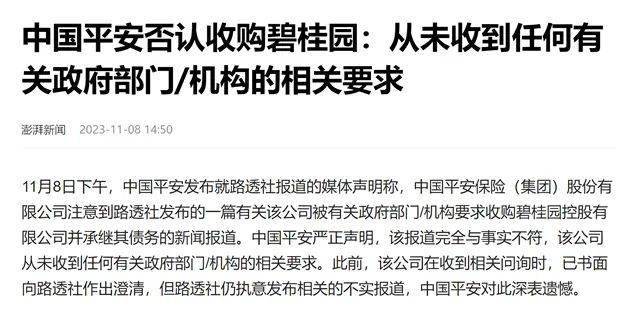 海西房产网(微信公众号:fjhxfcw)消息:据澎湃新闻报道,11月8日下午,中国平安发布就路透社报道的媒体声明称,中国平安保险(集团)股份有限公司注意到路透社发布的一篇有关该公司被有关政府部门/机构要求收购碧桂园控股有限公司并承继其债务的新闻报道。