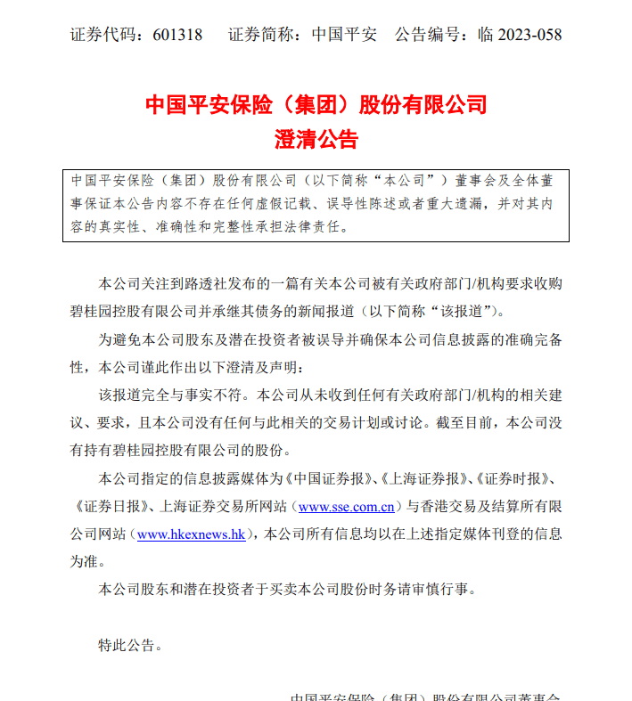 中国平安发布澄清公告,公司关注到路透社发布的一篇有关本公司被有关政府部门/机构要求收购碧桂园控股有限公司并承继其债务的新闻报道。该报道完全与事实不符。本公司从未收到任何有关政府部门/机构的相关建议、要求,且本公司没有任何与此相关的交易计划或讨论。截至目前,本公司没有持有碧桂园控股有限公司的股份。