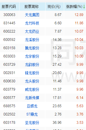 11月8日,“龙”字行情持续,天龙集团、龙竹科技(831445.BJ)涨超10%。龙溪股份、腾龙股份(603158.SH)、太龙药业、龙宇股份(603003.SH)、龙韵股份、锋龙股份(002931.SZ)、龙头股份(600630.SH)、威龙股份(603779.SH)等多家个股涨停。