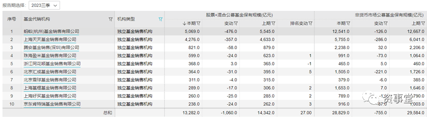 以第三方代销机构来看,蚂蚁、天天等头部机构,保有规模在3季度有所减少。