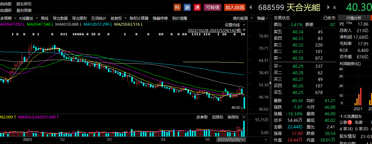 5月29日开盘,千亿光伏龙头天合光能快速跳水,盘中股价一度下跌近17%。截至5月29日收盘,天合光能报收于40.3元/股,当日股价下跌16.34%,总市值876亿元。