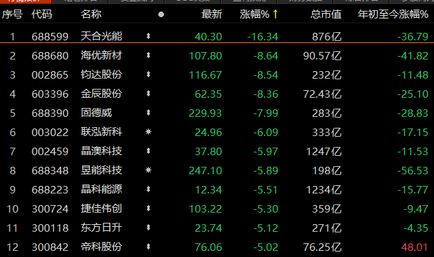 与此同时,光伏板块也走低,海优新材、钧达股份、金辰股份等股票今日跌幅均超过7%。